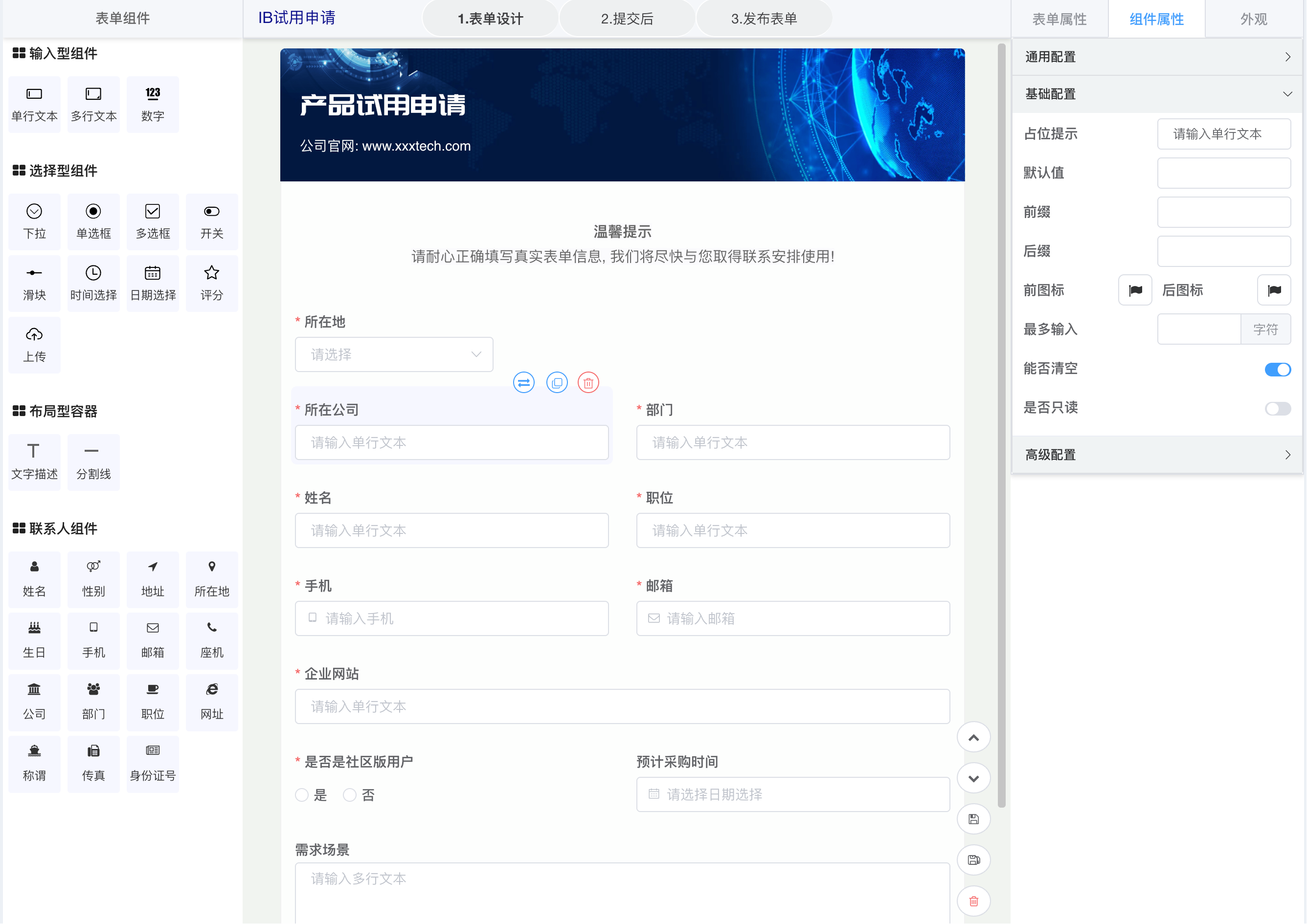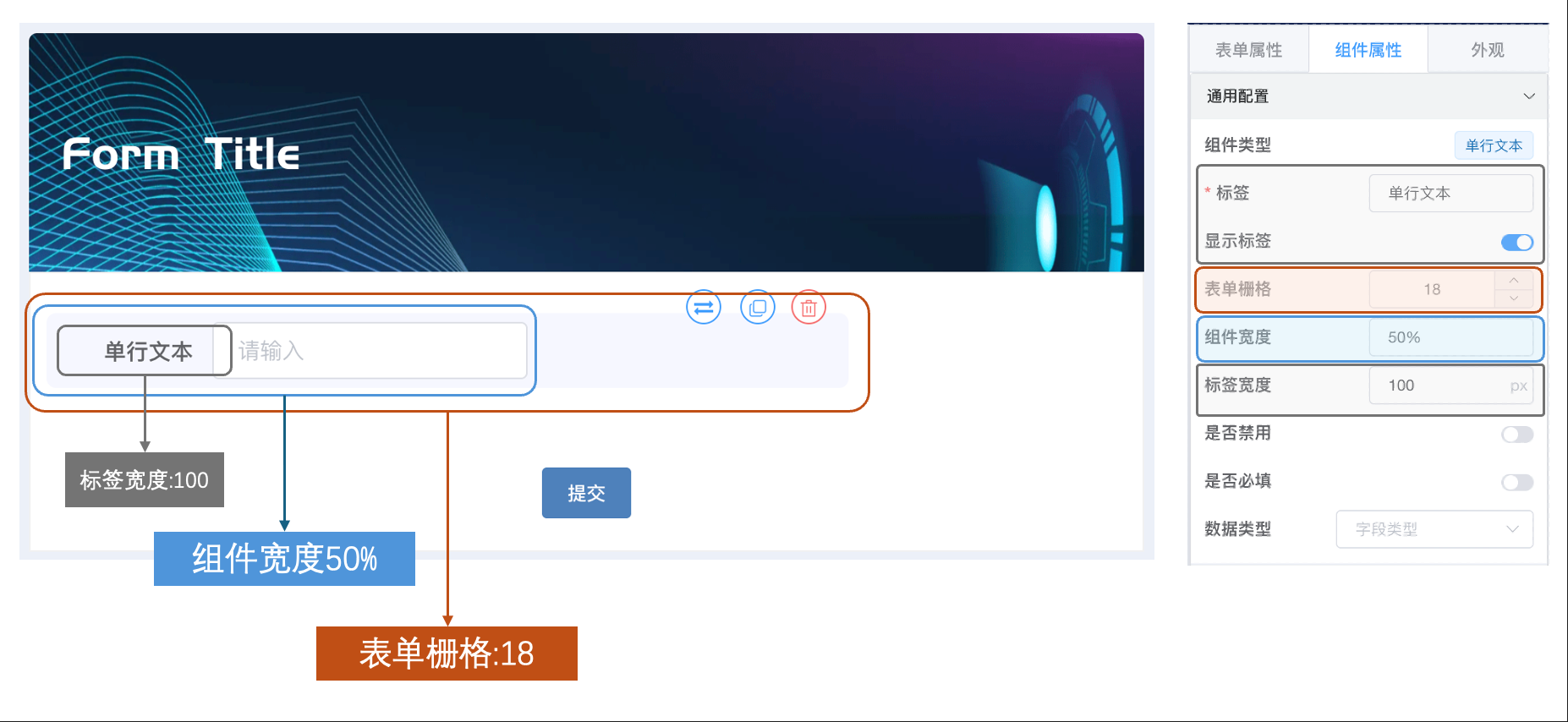 点击表单设计器中已添加的组件激活组件,激活组件之后,右边栏对激活的组件进行配置。