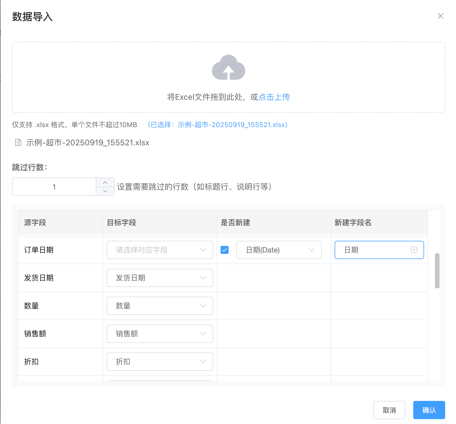 | 目标字段 | 选择系统中匹配的字段(如“发货日期”“数量”),或新建字段(如“订单日期”对应新建的“日期”字段)。 |