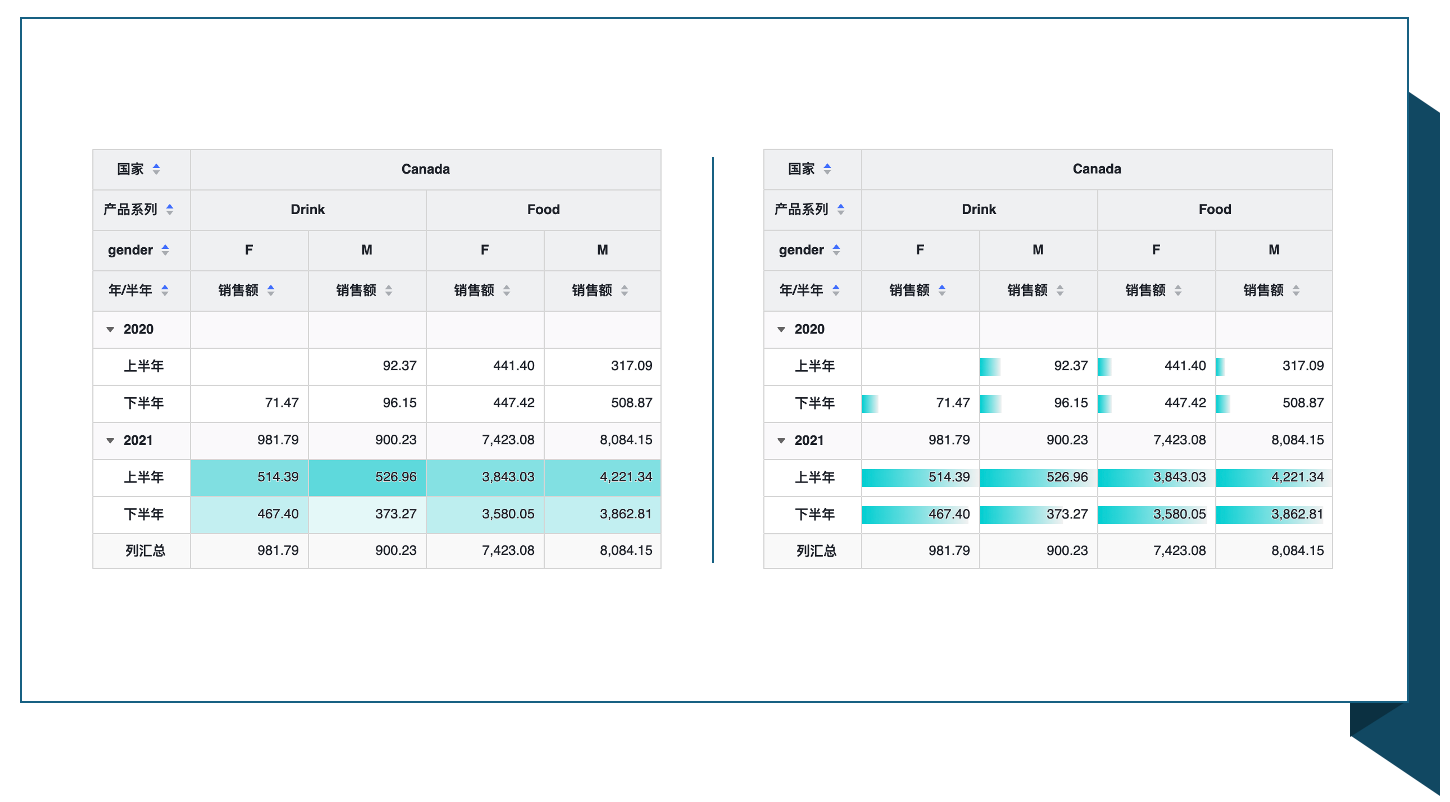 | 多列并行,视觉上信息密度高 | 列数减少,聚焦“销售额”维度,分析更直观 |