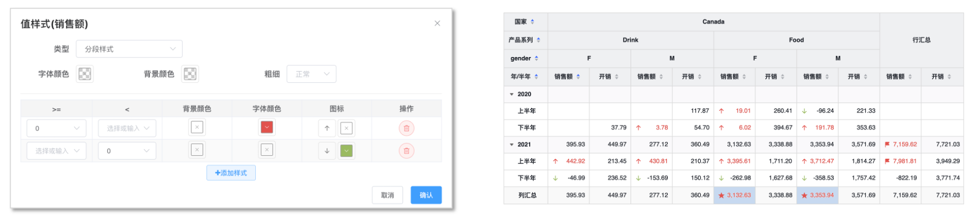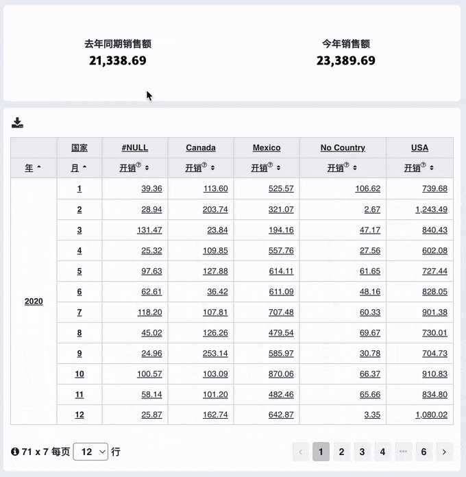 允许在同一表格中为单个字段配置多个联动事件(如图中“开销”列定义2个联动事件),用户可根据分析目的选择不同联动逻辑,实现“一单元格多分析路径”的灵活交互。