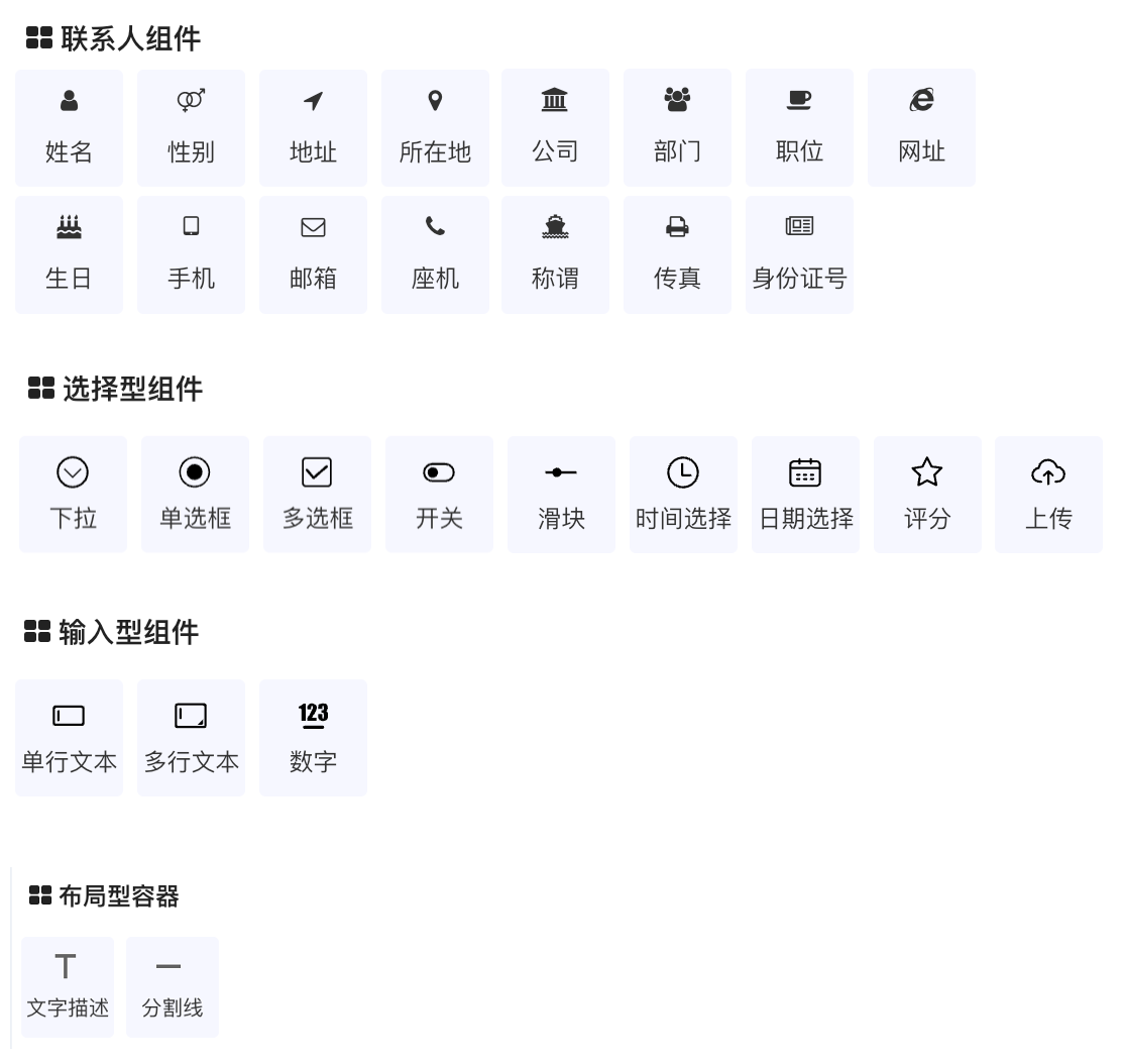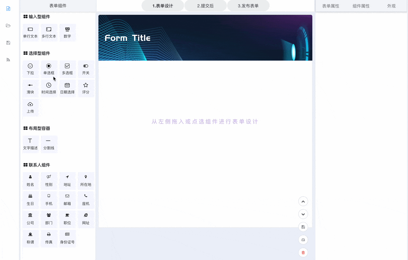 左侧表单组件栏选择需要添加的组件类型,再通过点击组件栏的组件,或者拖拽组件栏的组件,将组件添加到表单中