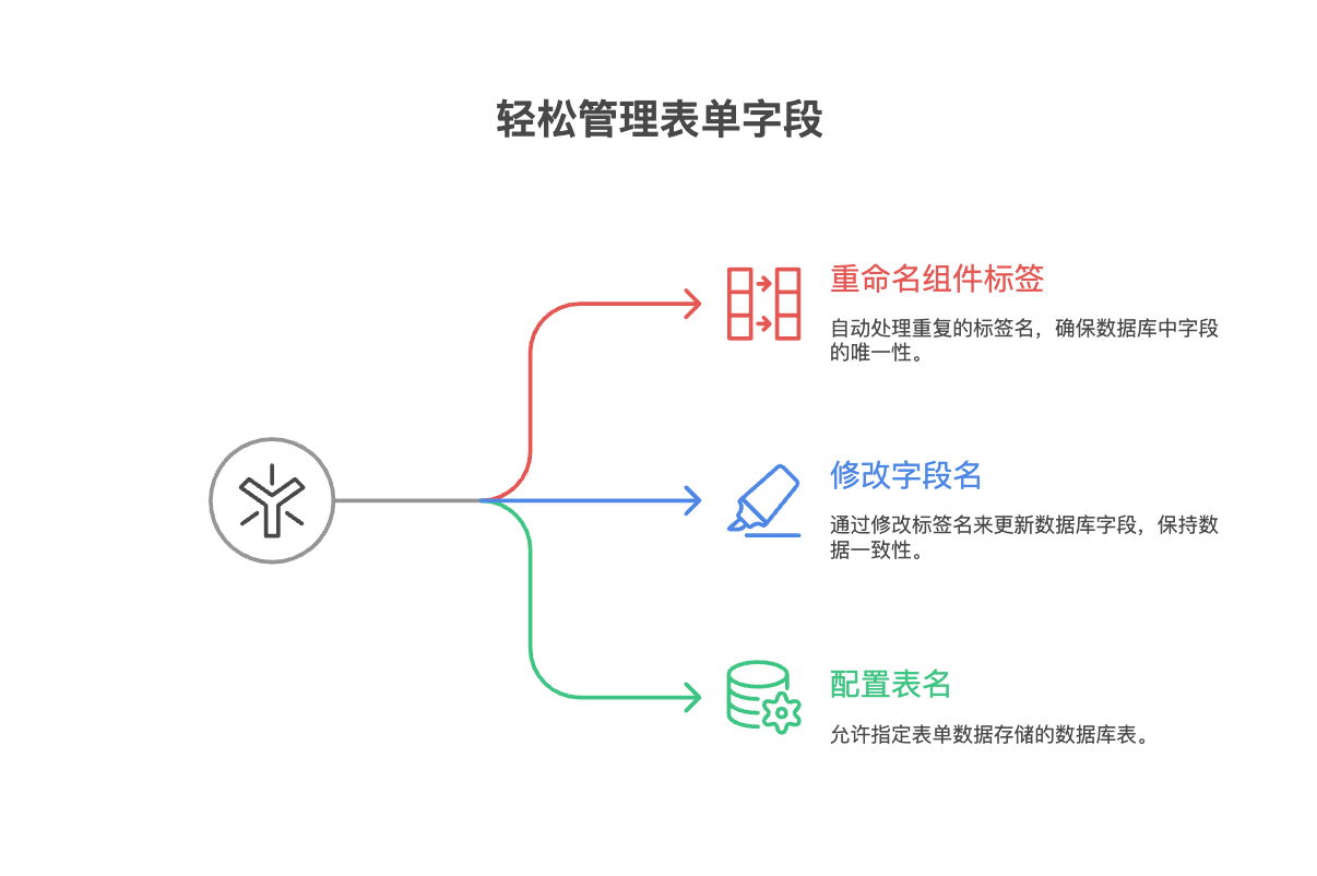 直接修改组件标签名即可同步更新数据库字段名,后台通过组件唯一ID判断操作类型:- 新增组件: 创建对应数据库字段;