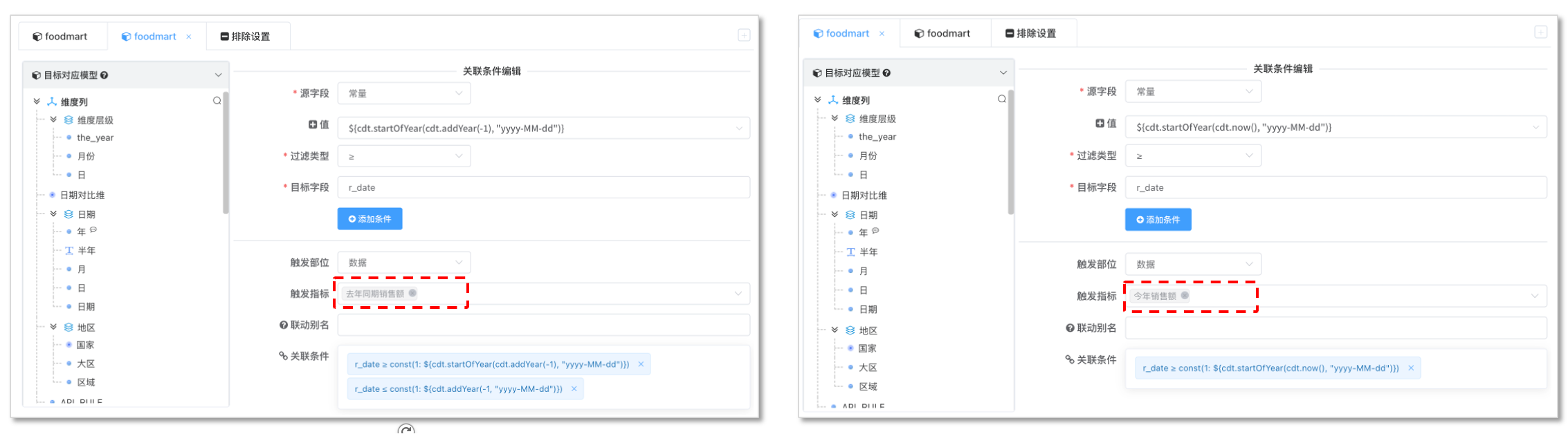 - 支持在联动常量值规则中嵌入环境变量表达式,通过内置cdt工具类自动计算日期范围(如当年 / 去年首日、日期偏移等),实现 “指标点击→动态日期计算→全看板图表联动过滤” 的闭环。