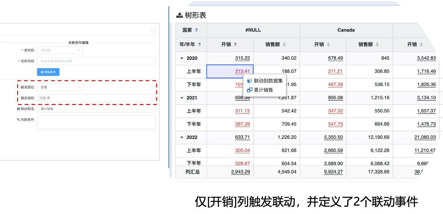 - 同一“开销”列可触发“联动到数据集”和“累计销售”两个独立联动事件(如图中树形表的“开销”列单元格触发的两个联动选项),分别展示不同维度的关联数据,满足多场景分析需求。