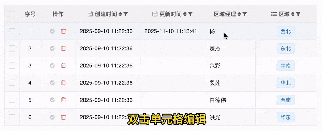 表单数据表格支持编辑,文本组件、下拉选择、日期选择、上传组件等,双击单元格切换单元格状态进入编辑模式,多选、单选、开关、评分等组件,编辑状态与查看状态采用视图统一, 即不用双击,直接编辑数据。